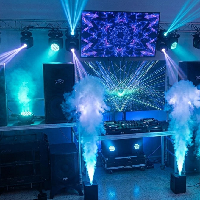 Un montaje compacto pero profesional que incluye sonido potente, iluminación dinámica y efectos que transforman cualquier espacio en una pista de baile.